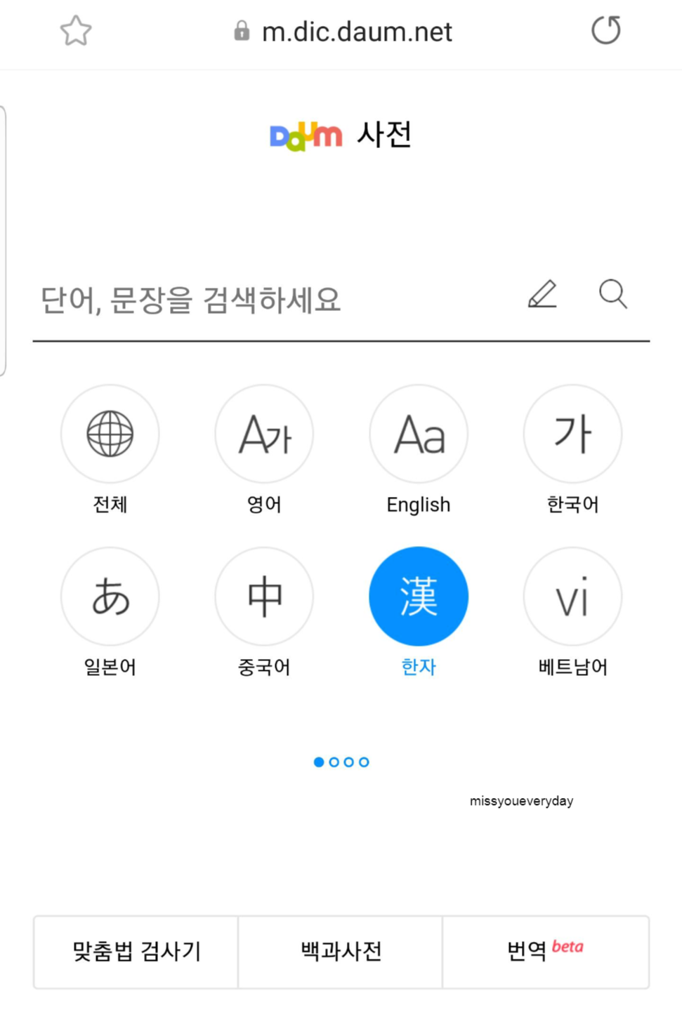 다음 사전으로 들어왔더니, 맨 첫줄에는 <단어, 문장을 검색하세요>라고 되어 있고 하단에 한자에 파란색으로 선택되어 있습니다. 하지만, 한자를 보고서 검색하는 거면 어떻게 검색해야 할지 난감한 상황입니다.