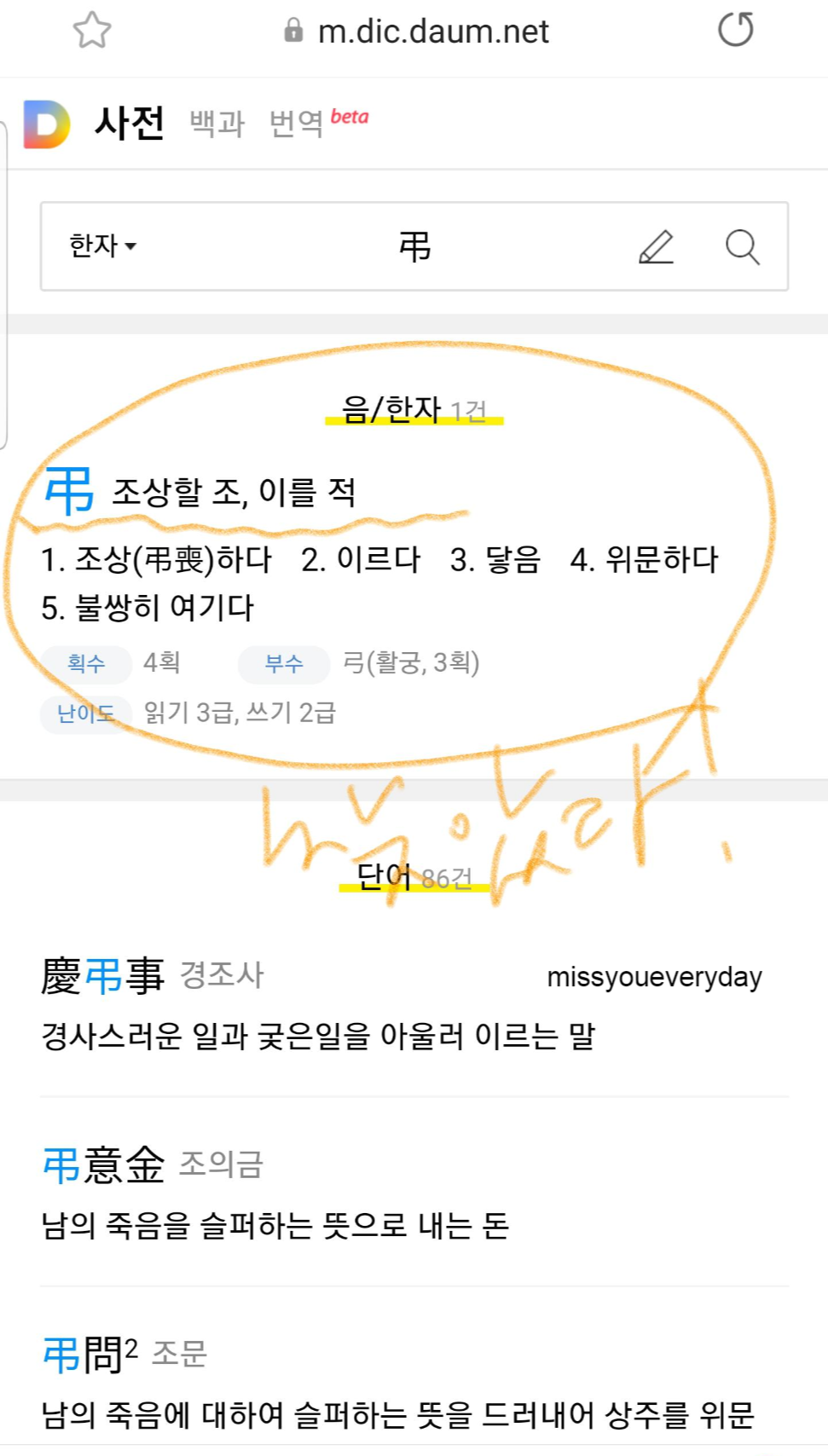 펜 모양을 누르고 나면 아래에 눈금이 그려진 곳이 보입니다. 그 눈금이 보이는 곳에 손으로 찾고 싶은 한자를 보고 그대로 따라 적으면 됩니다. 어느날 차를 타고 가는데 장례식장에서 운영하는 버스에서 뒤에 두 글자가 적혀있더라고요. 앞글자는 너무 복잡해서 따라 적기가 힘들고, 그래서 뒷글자를 한자사전으로 한번 검색해본 적이 있습니다. 불과 일주일 전이네요. 한자를 쓰면서 검색했더니 머릿속에 기억이 그대로 남아있어서 그 한자로 적어보았습니다.