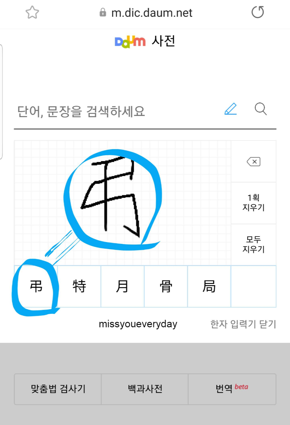 어떠신가요? 포털사이트 다음에서 한자사전을 검색한 후 필기인식을 통해 검색하는 방법을 알아보았습니다.