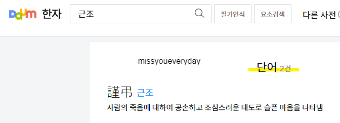 최종적으로 검색이 완료된 화면입니다. 아까 설명드렸다시피 제가 사용한 한자사전은 다음에서 제공하는 한자사전입니다. 맨 위에는 음과 한자의 뜻을 한꺼번에 보여주고 있고, 아래에는 해당 한자가 사용되는 단어를 예시로 제공하고 있습니다.