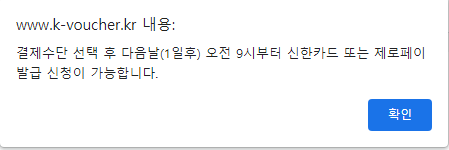 "플랫폼에서 바우처 결제 수단을 선택 후 다음날 (1일 후) 신한카드 또는 제로페이 발급 신청이 가능합니다. 결제수단 선택 후 추후 결제수단 변경은 불가합니다. 신한카드로 선택하시겠습니까?"라고 물은 뒤 "비대면 바우처 결제수단을 '신한카드'로 선택하였으며 번복 또는 변경이 불가합니다"에 동의를 해야 합니다.