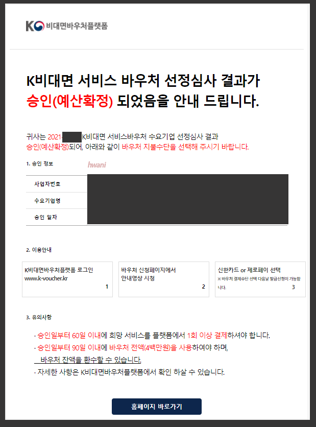 비대면바우처플랫폼 서비스를 7월경에 신청하고 심사 후 선정을 기다렸습니다. 심사가 어떻게 되었는지 진행사항은 별도 알림을 준다고 했었는데요. 드디어 승인(선정)되었다는 메일을 받았습니다.