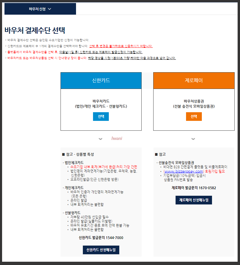 주의할 점은 한번 선택하면 바우처 결제수단의 종류를 바꿀 수 없다는 점인데요. 이점을 잘 확인하고 선택하여야 합니다.