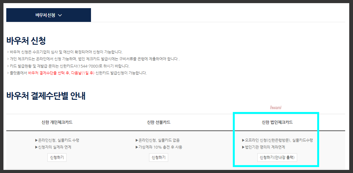 바우처 결제수단을 "신한카드"로 결정하고 나니 결제수단별 안내가 나옵니다. 법인 체크카드의 경우에는 직접 신한은행에 방문하여야 하는데 신청하기를 누르면 하루가 지난 다음 오전 9시부터 신청할 수 있다고 되어있습니다.