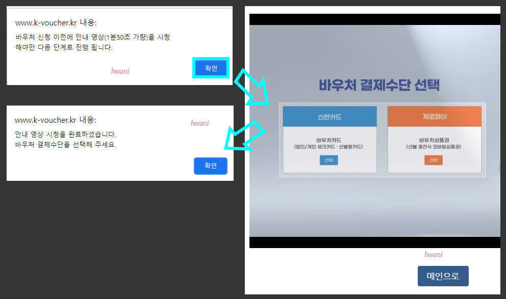 2. 바우처신청으로 들어가서 팝업 확인 → 동영상 신청(1분 50초가량) → 영상시청완료 팝업 확인