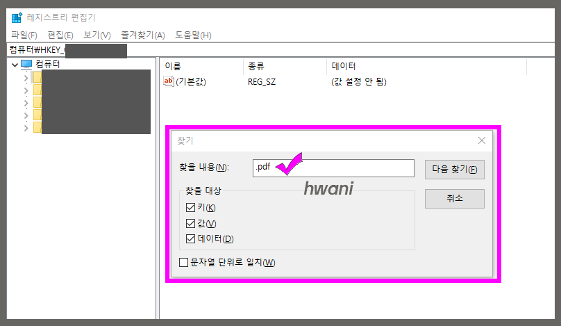 레지스트리편집기를 실행시킨 뒤 컨트럴과 F를 눌러서 찾기 팝업이 나오게 한다. 찾을내용에는 .pdf를 입력하여 다음찾기를 누른다.