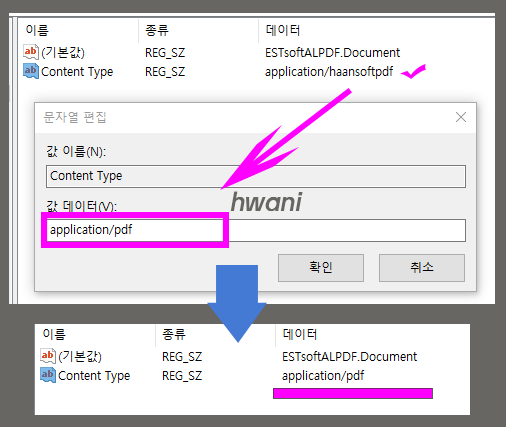 Content Type을 더블클릭했더니 '문자열 편집'이라는 팝업이 나온다. 여기서 값 이름은 그대로 두고 값 데이터를 변경한다. 기존에 application/haansoftpdf로 되어있던 것을 application/pdf 로 바꾸면 된다. 바꾼 다음에 확인을 누른다.