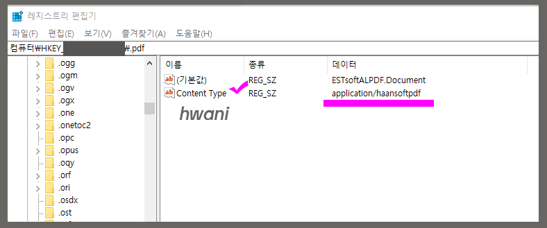 <.pdf>로 거맥하고 나니 이름이 Content Type이라는게 보인다. 여기서 데이터를 확인해보자. application/haansoftpdf 로 되어있다면 데이터값을 변경해야한다.