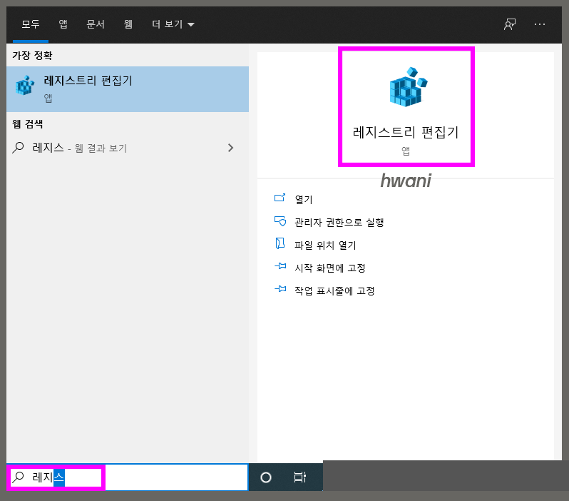 윈도우10을 사용하고 있기 때문에 홈버튼 근처에 있는 검색창에서 <레스스트리>를 검색했다. '레지스트리 편집기'를 눌러서 앱을 실행시킨다.