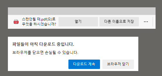 갑자기 왜이러지? PDF파일이 안열린다. 파일을 열면 화면에 아무것도 안보이고 아래에 '무엇을 하시겠습니까?'라는 내용이 나온다. 그래서 열기를 눌렀더니 파일은 안열리고 똑같은 내용만 반복해서 묻는다. 그래서 창을 닫았더니 "파일들이 아직 다운로드 중입니다. 브라우저를 닫으면 손실될 수 있습니다."라는 팝업이 생긴다.