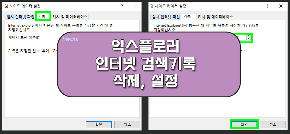 기록에서는 익스플로러에서 방문한 웹 사이트 목록을 저장할 기간(일)을 지정하라고 되어있다. 페이지 보관 일수가 0이 아닌 경우에는 0으로 바꿔두고 하단에 확인을 눌러주면 된다!