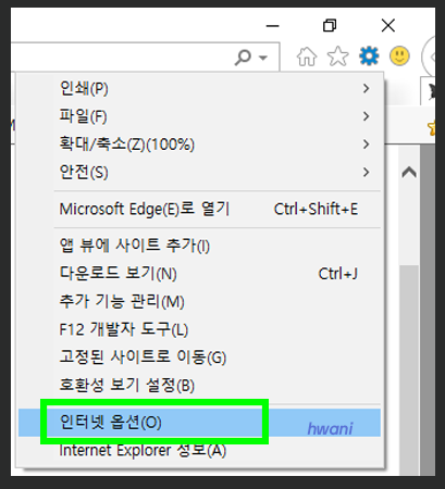 익스플로러를 켠 상태에서 창을 끄는 쪽을 보면 톱니바퀴가 보인다. 톱니바퀴를 누르면 여러 가지 메뉴가 나오고 여기서 <인터넷 옵션>을 선택한다.