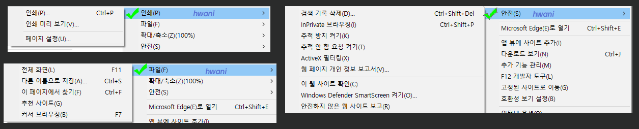 *익스플로러 설정 메뉴에서는 인쇄/ 파일/ 확대 및 축소/ 안전/ 마이크로소프트 엣지로 열기/ 앱 뷰에 사이트 추가/ 다운로드 보기/ 추가 기능 관리/ F12 개발자 도구/ 고정된 사이트로 이동/ 호환성 보기/ 인터넷 옵션/ 인터넷 익스플로러 정보를 확인할 수 있다. 확대 축소는 몇 %로 할것인지 선택할 수 있으며, 인쇄와 파일, 안전에 대한 하위 메뉴는 아래와 같다.