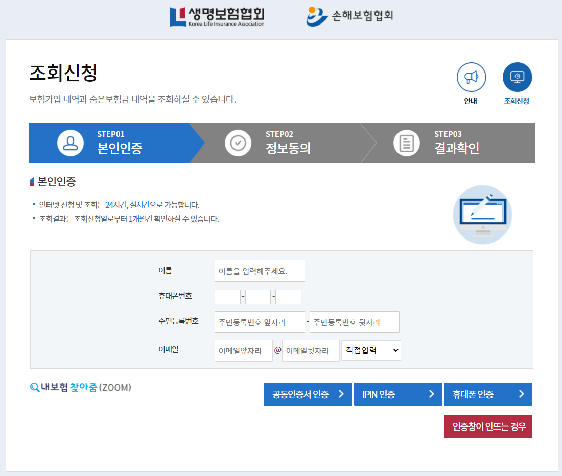 조회신청 화면이 보이면 본인인증을 먼저 해야 한다. 이름과 휴대폰 번호, 주민등록번호, 이메일 주소를 입력하고 마지막으로 공동인증서 인증이나 IPIN인증 혹은 휴대폰 인증 중에서 선택하여 인증을 완료한다. 주민등록번호는 뒷자리까지 모두 입력해야 하며 이메일은 적지 않아도 인증이 가능하다.